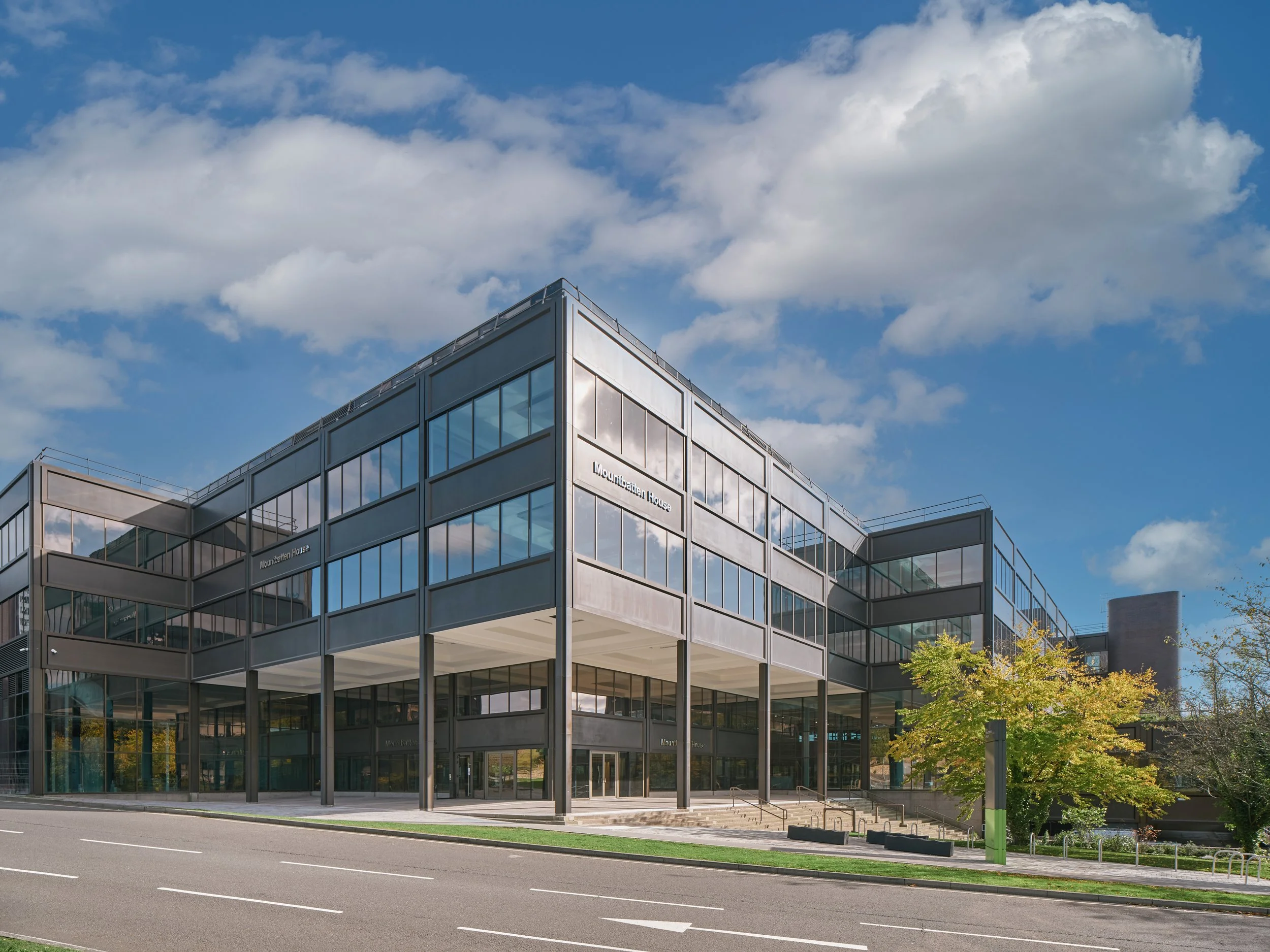 Modern multi-story office building with glass windows, trees, sidewalk, and a street under a partly cloudy sky.
