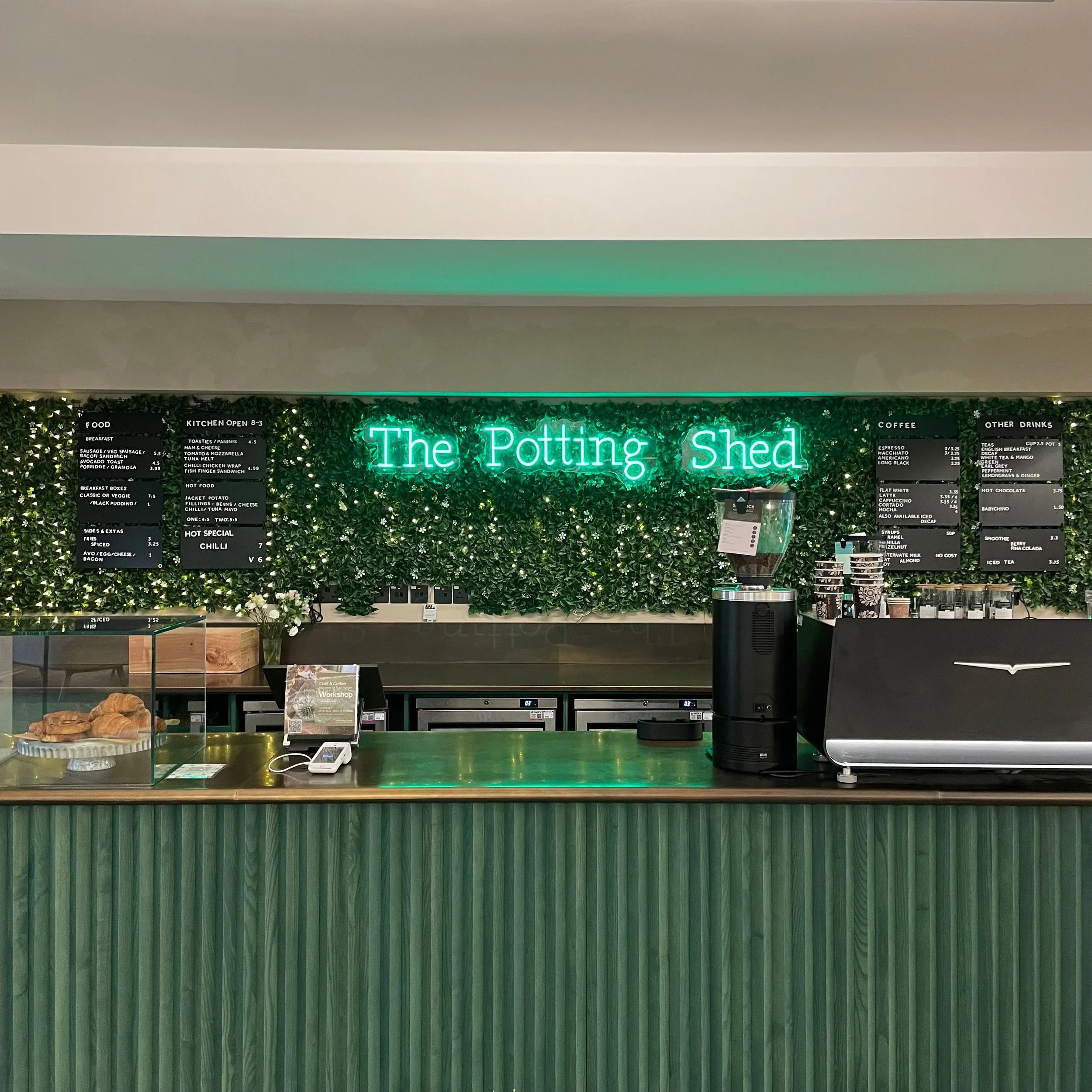 Counter at The Potting Shed cafe with a green leafy wall, neon sign, coffee, pastries, and menu boards.