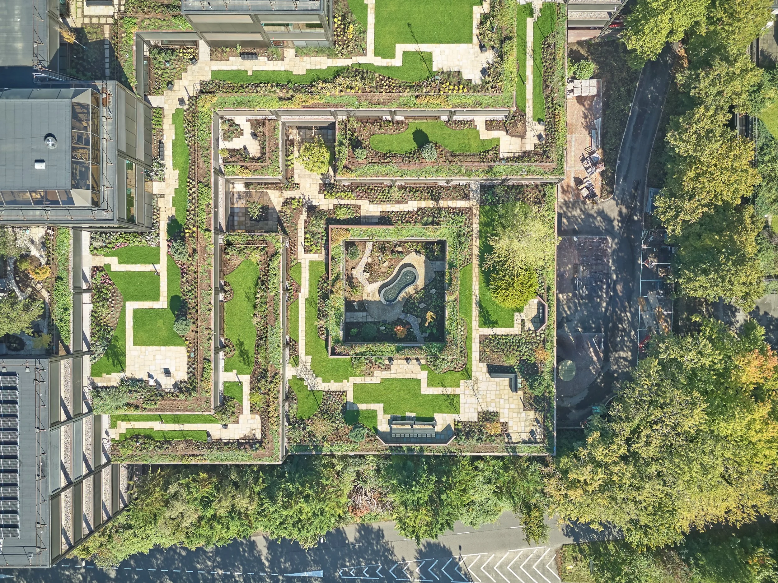 An aerial view of a modern urban rooftop garden with pathways, greenery, and a small pond at the center, surrounded by buildings and trees.